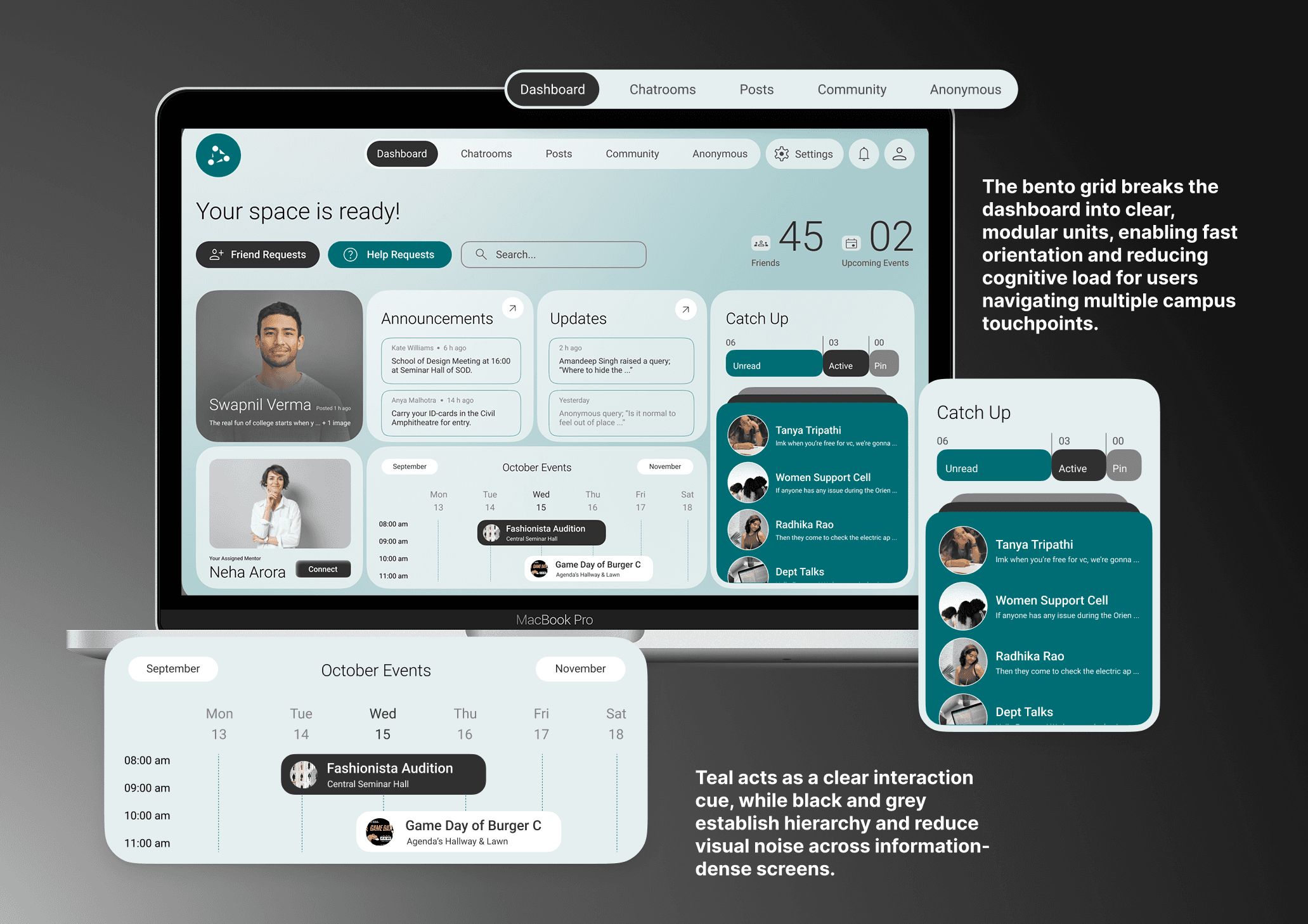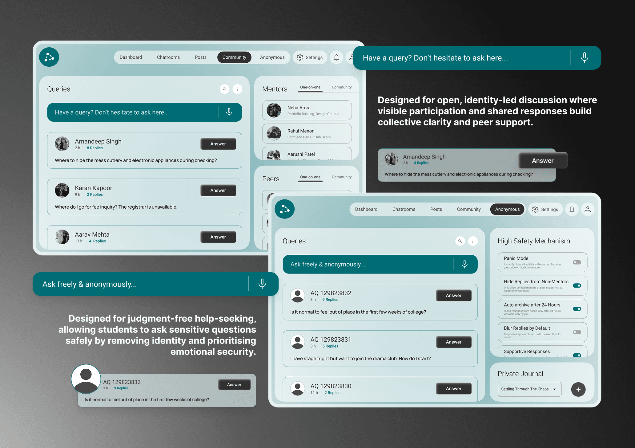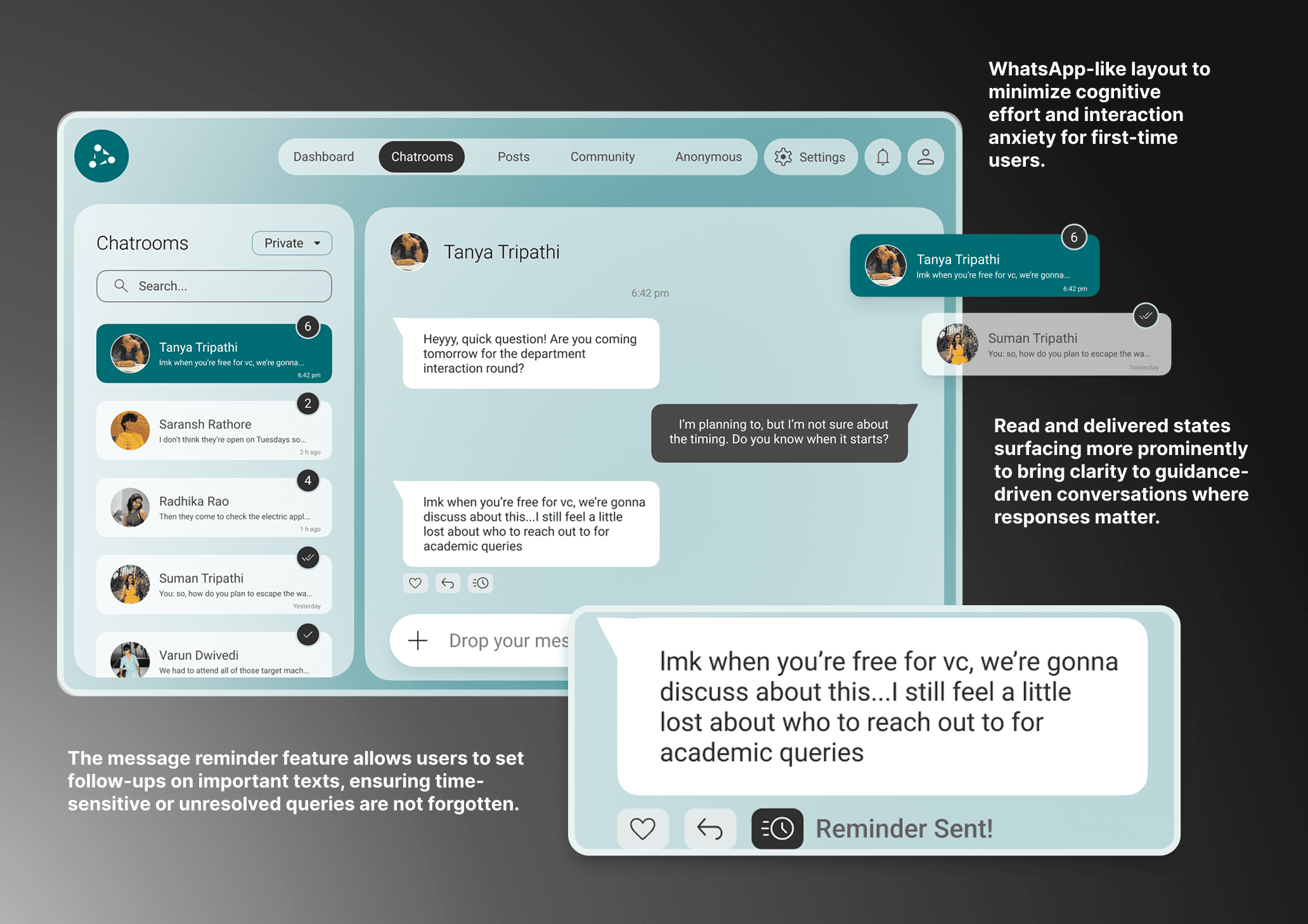 Freshers often pause not because they lack information, but because they are unsure where they belong within it. The design responds by making intent immediately legible. Familiar conversational structures lower the anxiety of reaching out, while subtle cues bring clarity to moments that matter. Identity flexibility, reminders, and contextual visibility ensure that participation is a choice, not a performance.