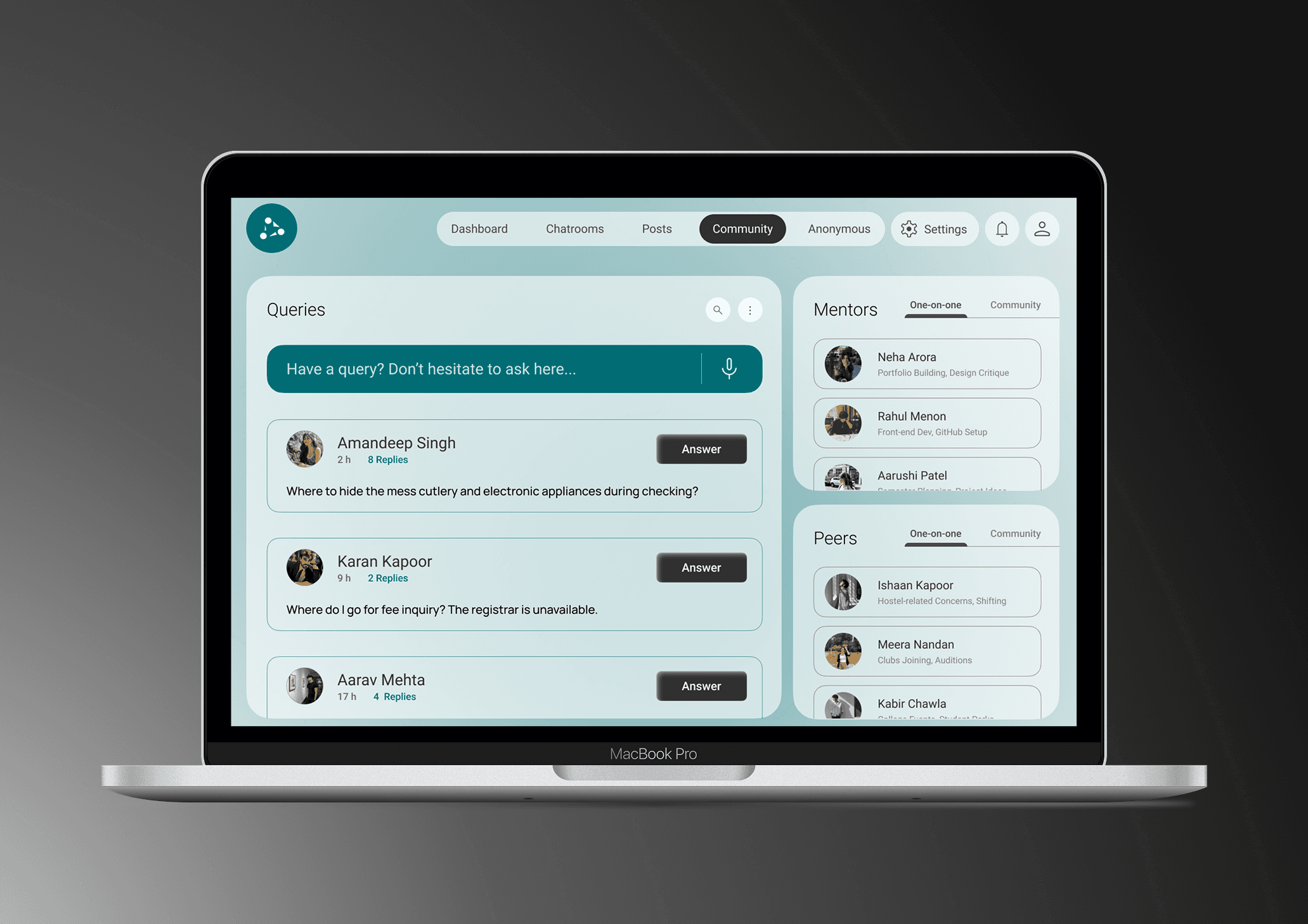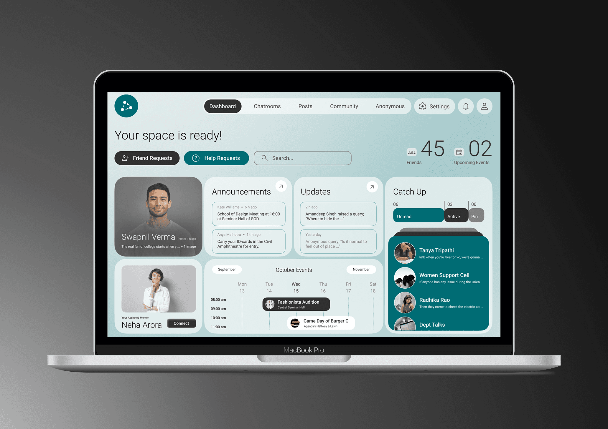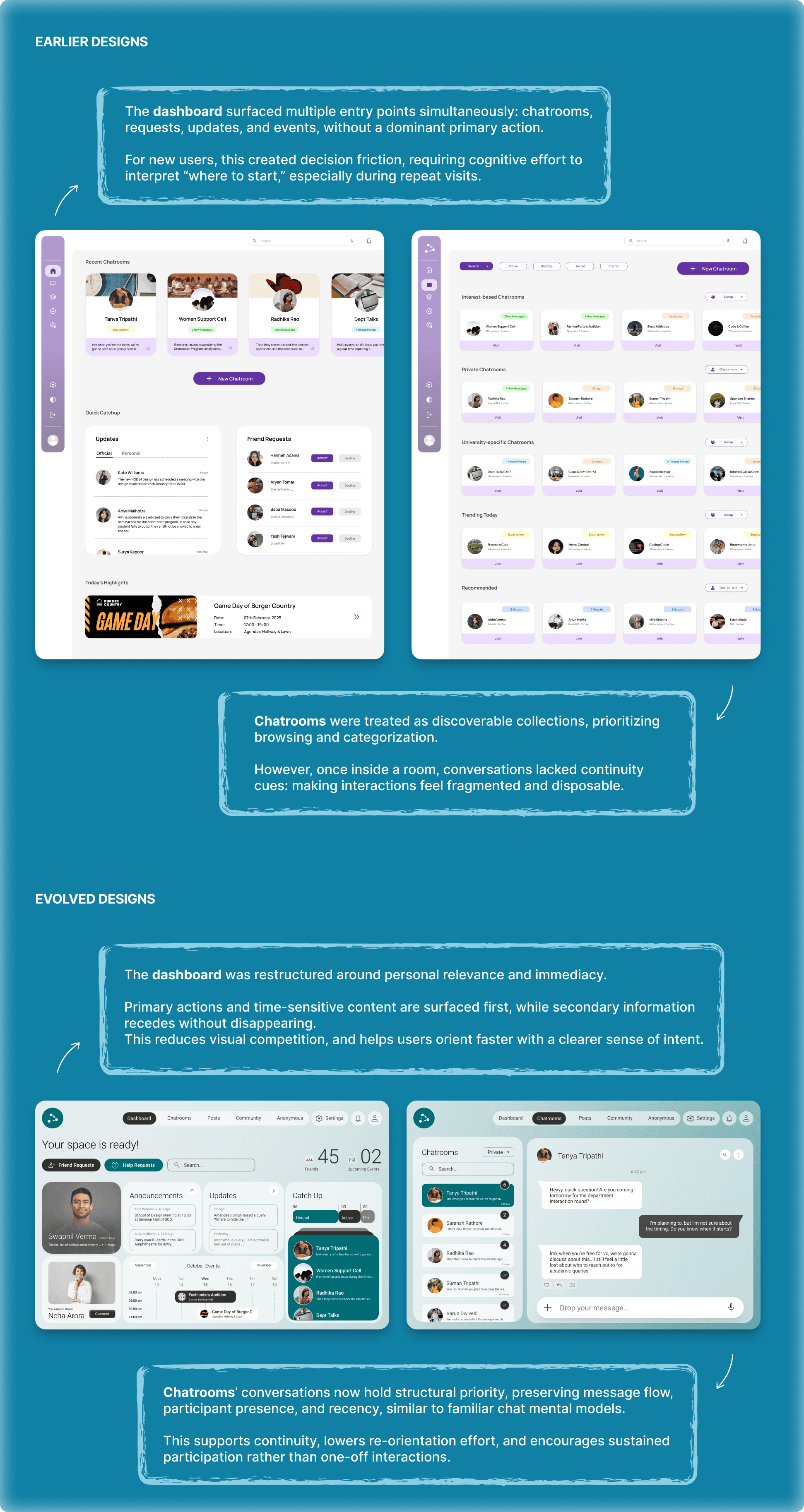 Freshers often pause not because they lack information, but because they are unsure where they belong within it. The design responds by making intent immediately legible. Familiar conversational structures lower the anxiety of reaching out, while subtle cues bring clarity to moments that matter. Identity flexibility, reminders, and contextual visibility ensure that participation is a choice, not a performance.