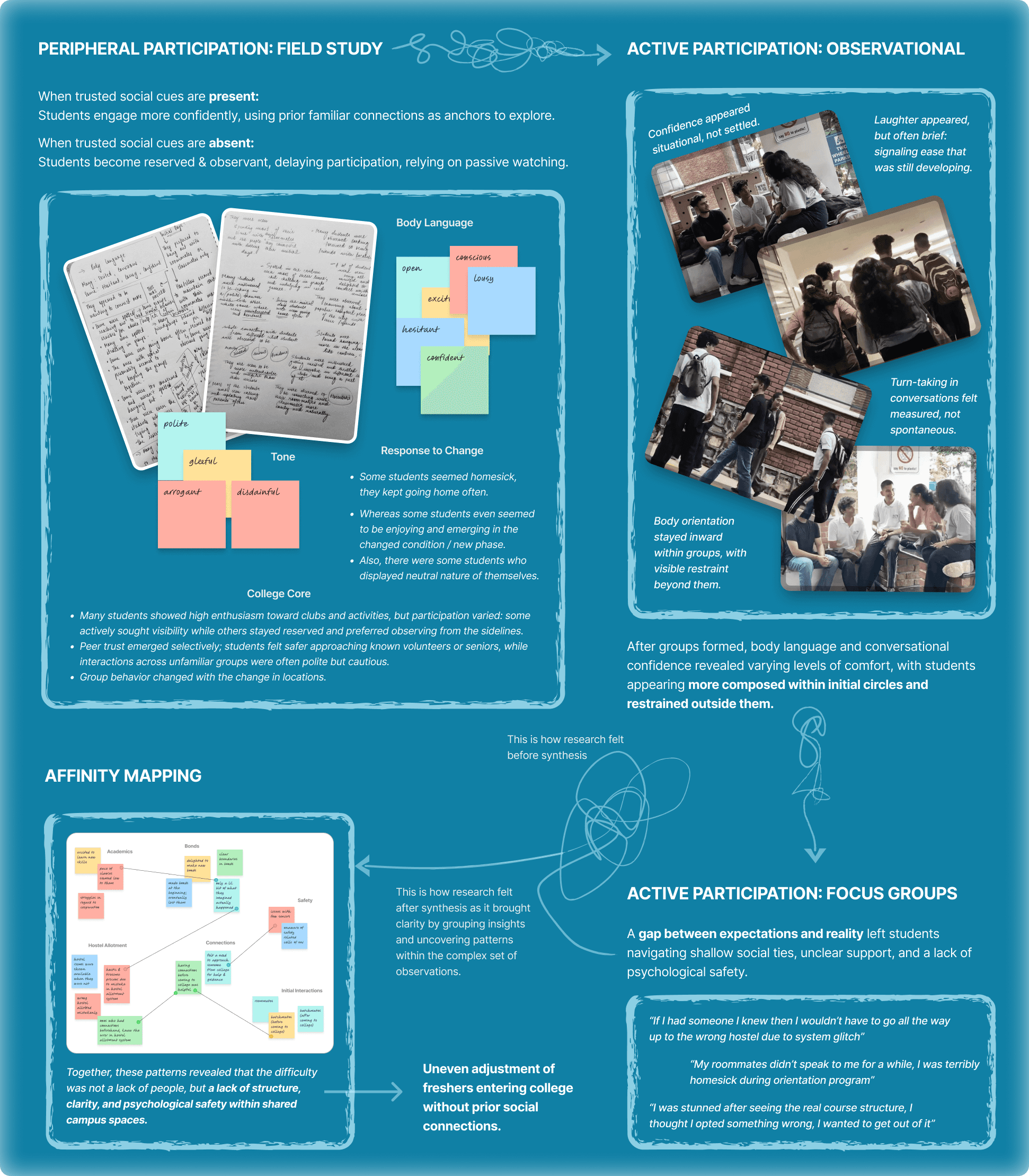 Project Genesis: During an earlier ethnography assignment in college, I struggled more than I expected and underperformed. The experience stayed with me beyond the grade. Later, while observing freshers navigating their first weeks on campus, I revisited the same methodology with patience to understand how subtle behaviours, hesitation, and social cues shape adjustment.