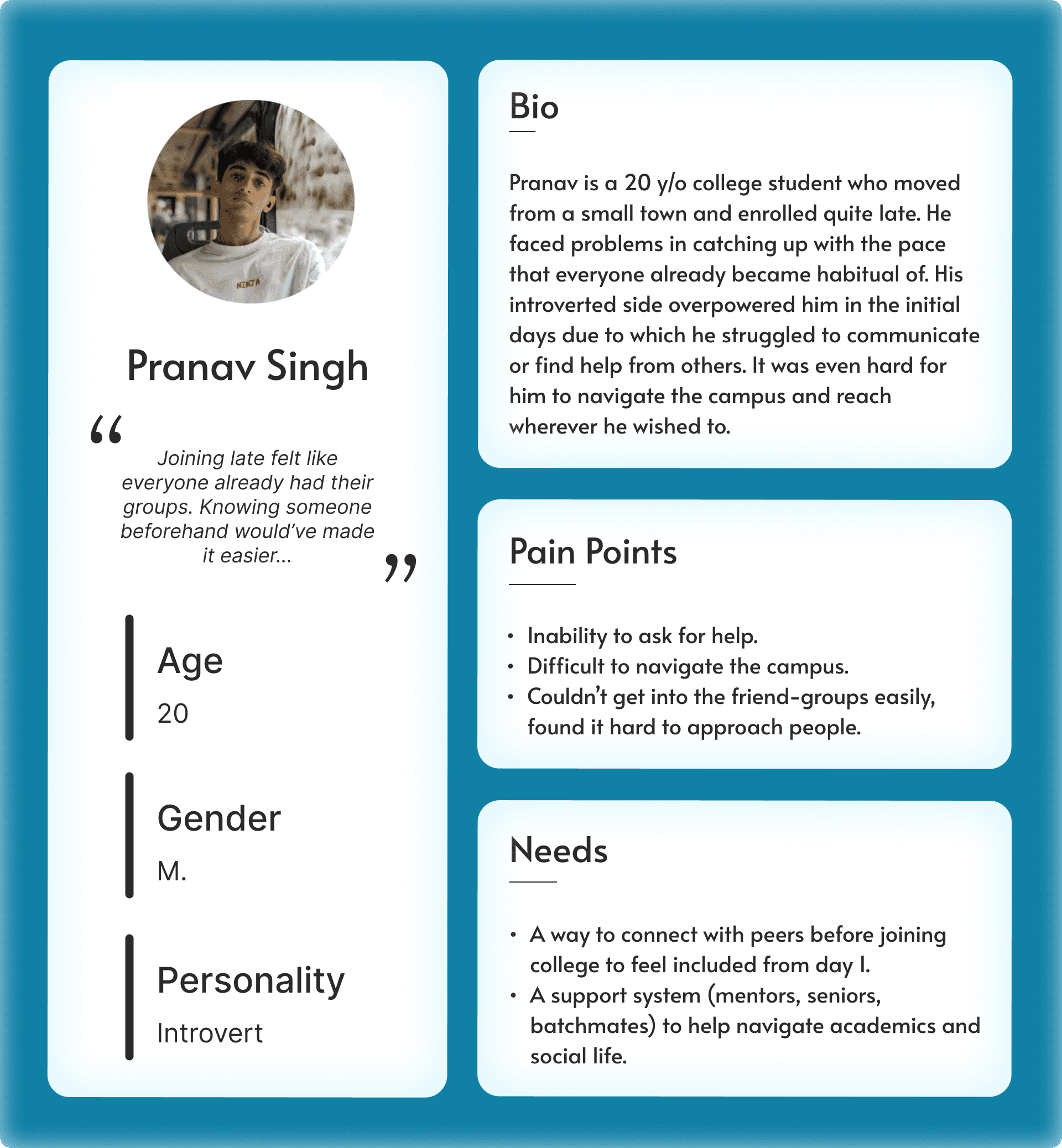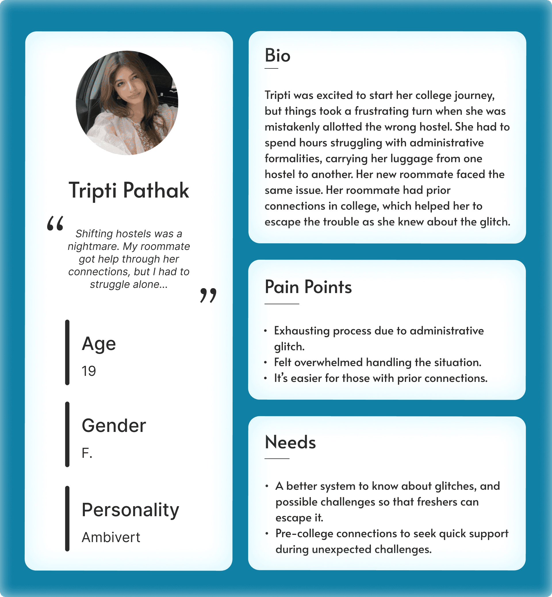 These personas capture the emotional and structural gaps that shape how freshers experience the same campus differently.