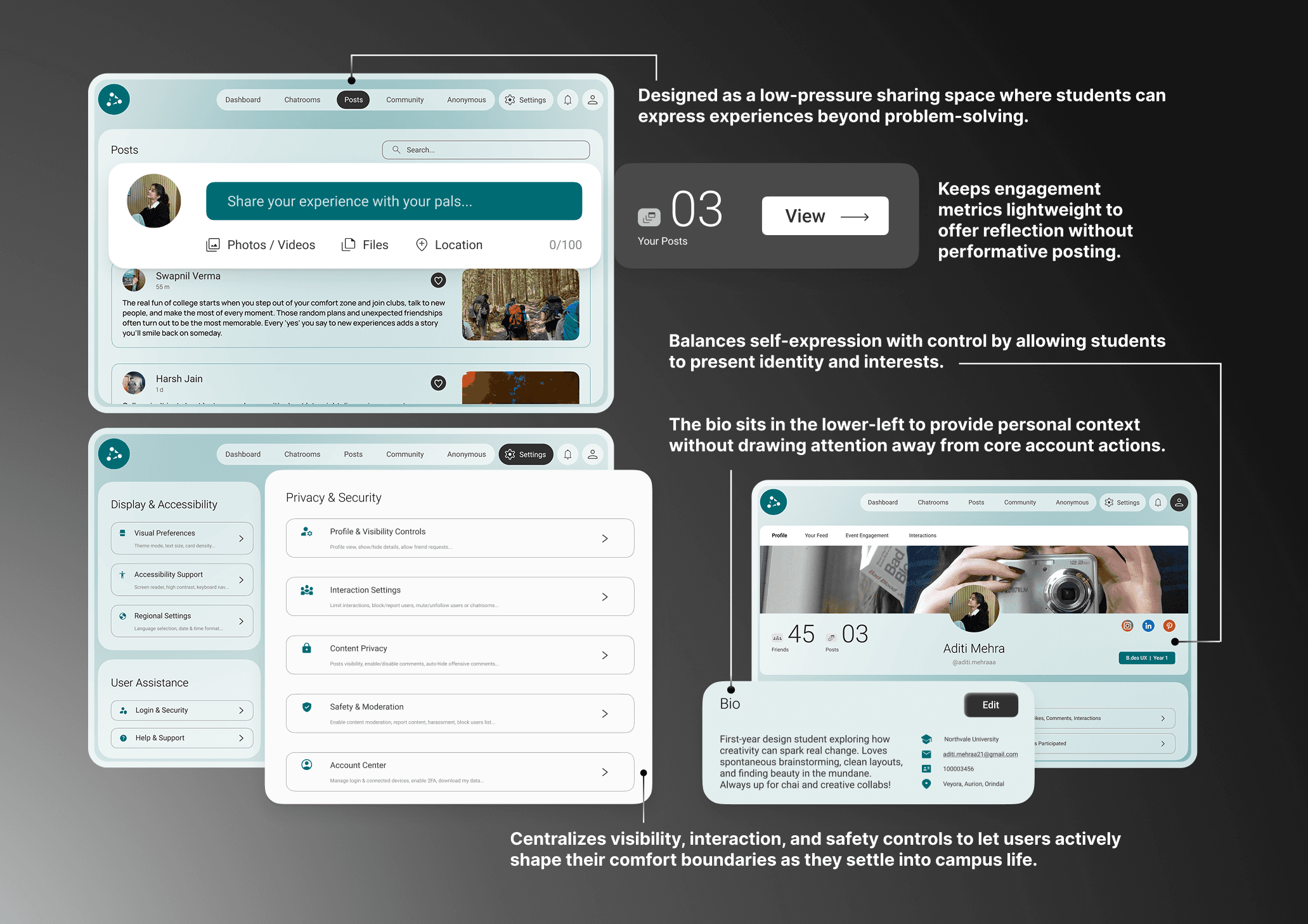 One enters college already playing catch-up, hesitant to ask, unsure where to turn, and quietly observing before acting. Another confronts institutional friction but realizes support flows faster for those with existing connections. Their challenges are not about capability; they are about access, timing, and psychological safety. By grounding the design in these lived realities, the system prioritizes clarity, guided help-seeking, and equitable entry into participation, so adjustment does not depend on who arrived with advantage.